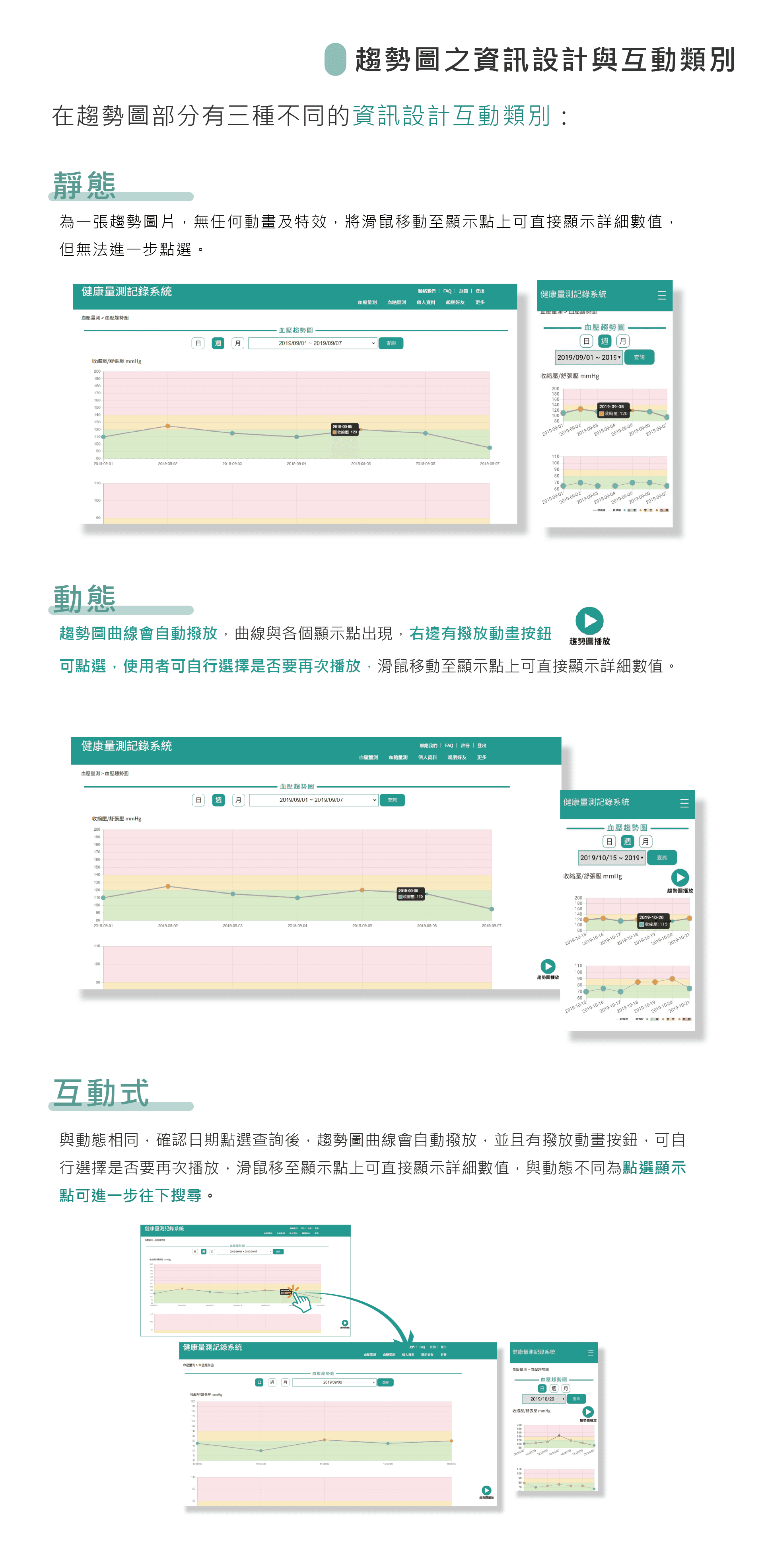 過量化與質性研究,了解市面上現有健康量測紀錄APP操作問題及趨勢圖資訊設計等問題;並使用內容分析法重新繪製資訊架構內容地圖,重新設計健康量測紀錄介面,研究結果提出設計建議與規範,並產出最終介面設計。
