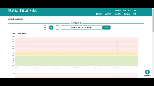 健康量測紀錄介面可即時記錄血壓血糖等生理數據,並透過趨勢圖之資訊設計,讓使用者更為直覺了解生理健康趨勢與數據